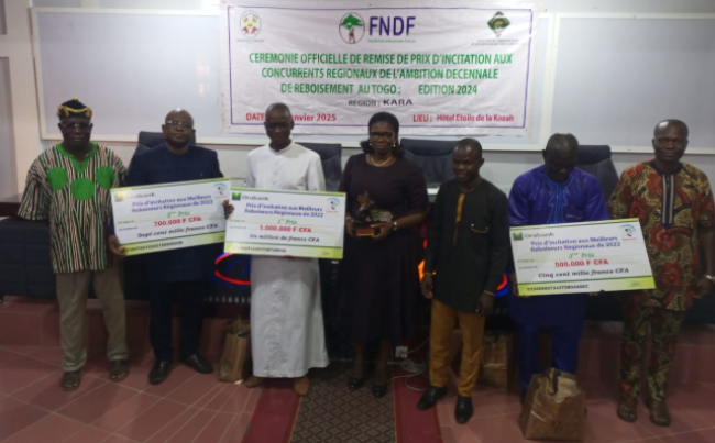 Le Col. Faré Bonfoh (militaire des forces armées togolaises, nouveau Préfet de la Kozah), qui a planté 8.700 arbres sur une superficie de 7 hectares, avec un taux de réussite de 80%, a remporté le 2ème Prix du Meilleur reboiseur : un chèque de 700.000 F CFA et d’un lot de gadgets.