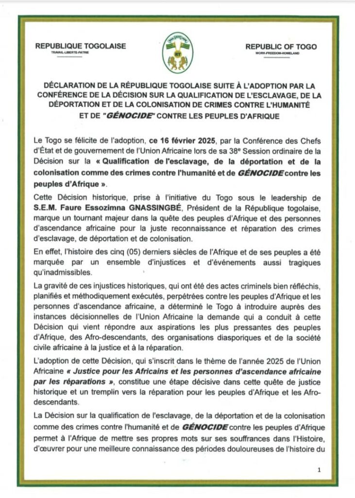 Cette « décision historique, prise à l’initiative du Togo sous le leadership du président Faure Gnassingbé, président de la République togolaise, marque un tournant majeur dans la quête des peuples d’Afrique et des personnes d’ascendance africaine pour la juste reconnaissance et réparation des crimes d’esclavage, de déportation et de colonisation », souligne la déclaration publiée par le Togo, à l’issue de l’adoption du texte par la Conférence des chefs d’Etats.