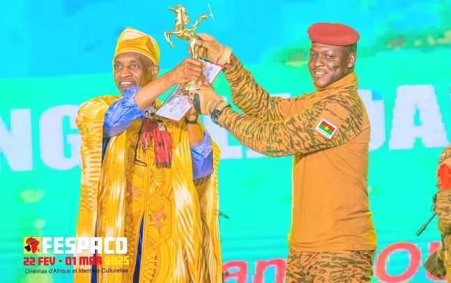 Le réalisateur et producteur de 63 ans a reçu son trophée des mains du chef de la junte au pouvoir au Burkina Faso, le capitaine Ibrahim Traoré, comme toujours vêtu de ses habits militaires, sous une acclamation des nombreux festivaliers, au palais des sports de Ouagadougou.