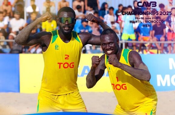 Exploit retentissant pour la paire masculine togolaise lors de la Coupe Continentale de Beach-Volley 2025. Opposés au duo marocain Elgraoui/Illiyas, champions d’Afrique en titre, les Togolais ont signé une victoire mémorable, s’imposant en trois sets (16-21, 21-16, 19-17) au terme d’un match d’une intensité remarquable sur le sable de Martil (Maroc).