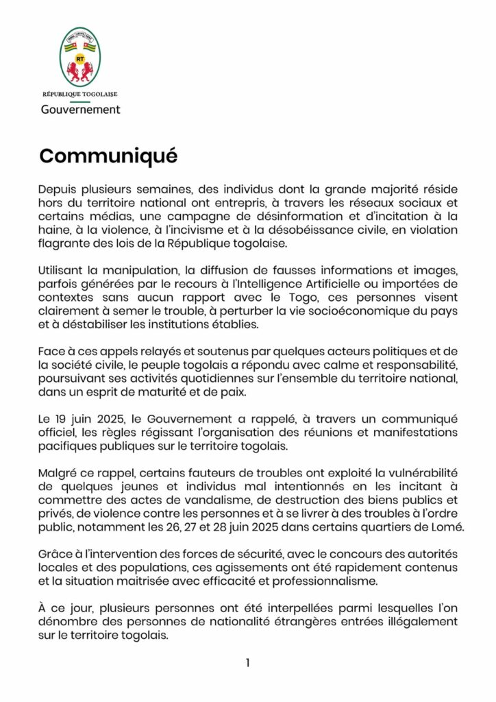 Le gouvernement « félicite les forces de sécurité pour leur professionnalisme et leur sens de responsabilité et remercie les populations qui, avec civisme, ont refusé de céder aux actes de provocations et ont contribué à préserver la paix et la sécurité des personnes et des biens publics et privés ».