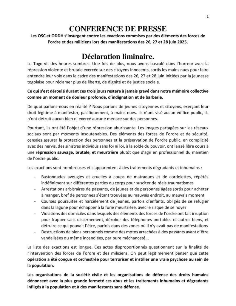 Des organisations de la société civile (Osc) et Organisations de défense des droits de l’Homme (ODDH) ont dénonce ce dimanche lors d’une conférence de presse, une « répression sauvage, brutale, et meurtrière » lors des manifestations des 26, 27 et 28 juin à Lomé.