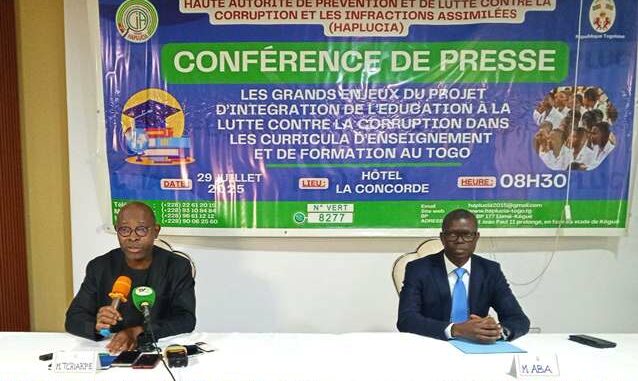 Le président de la Haute Autorité de Prévention et de Lutte contre la Corruption et les Infractions Assimilées (HAPLUCIA) Aba Kimelabalou et le ministre de l’enseignement technique, de la formation professionnelle et de l’apprentissage ont présenté aux médias le mardi 29 juillet 2025 à Lomé, les grands enjeux du « projet d’intégration de l’éducation à la lutte contre la corruption dans les curricula d’enseignement et de formation au Togo ».
