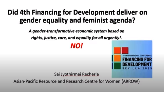 « L’agenda féministe fait référence à un système économique de transformation de genre qui est basé sur les droits à la justice, aux soins et à l’égalité pour tous de manière urgente. C’était un point central de la Déclaration politique du Forum féministe qui s’est tenu avant la FfD4 à Séville, en Espagne. Mais la FfD4 n’a pas réussi à mettre en œuvre l’égalité des genres et l’agenda féministe », a déclaré Sai Jyothirmai Racherla, directrice exécutive adjointe du Centre de ressources et de recherche Asie-Pacifique pour les femmes (ARROW).