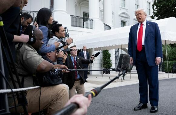 Donald Trump devant des journalistes le 21 septembre 2025 sur la pelouse sud de la Maison Blanche
